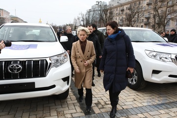 Ceremonia przekazania wozów bojowych na linię frontu odbywa się na placu Sofijskim w Kijowie, stolicy Ukrainy