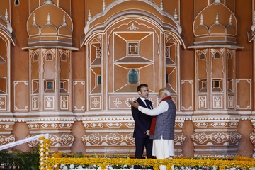 Premier Indii Narendra Modi i prezydent Francji Emmanuel Macron odwiedzają Hawa Mahal, znany również jako Pałac Wiatrów w Jaipur