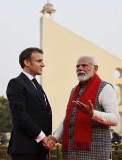 Premier Indii Narendra Modi i prezydent Francji Emmanuel Macron podczas wizyty w Obserwatorium Janta Mantar w Jaipu