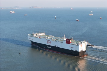 Nowe samochody czekają na załadunek na nowo ukończony statek ro-ro o nazwie BYD Explorer No.1
