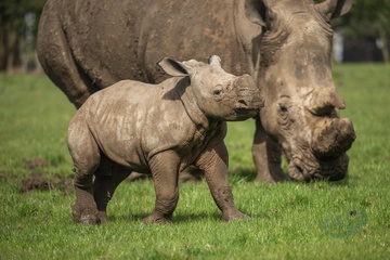 Baby rhino enjoys spring sunshine