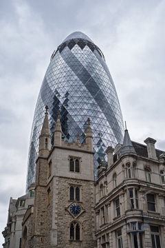 Contrasting architecture in St Mary axe in The City of London , london, UK.