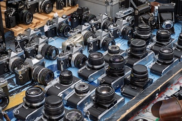 Secondhand 35mm cameras on sale at Portobello Road market, Notting Hill, London,UK