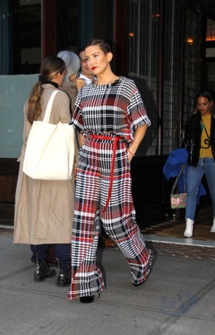 Kate Hudson w kraciastych spodniach i bluzce jak z koca