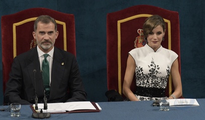 Krolowa Letizia w sukience Caroliny Herrery i krol Filip na ceremonii wreczenia nagrod Ksiezniczki Asturii