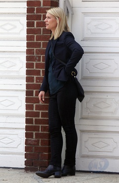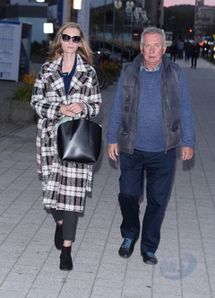 Sarah Ferguson w granatowym plaszczyku i z torebka ze zdjeciem corek