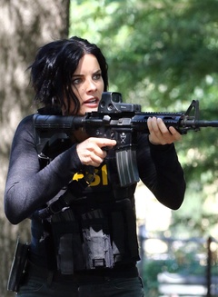 Jaimie Alexander z karabinem na planie zdjeciowym