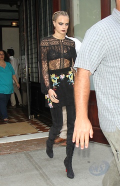 Cara Delevingne w przeswitujacej, koronkowej bluzce