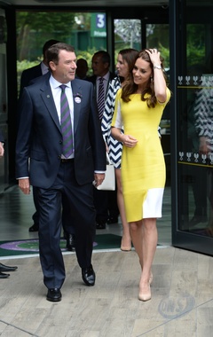 Ksiezna Kate w zoltej, prostej sukience na Wimbledonie