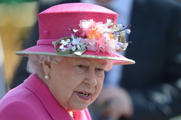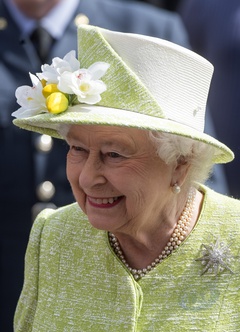 Krolowa Elzbieta II w wiosennym kapeluszu z kwiatami