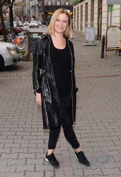Gwyneth Paltrow w bialym plaszczyku idzie do telewizji