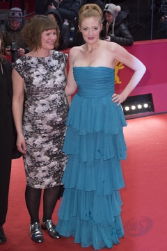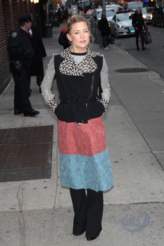 Kate Hudson w bialo czarno czerwonym plaszczyku