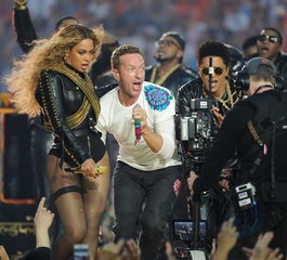 Lady Gaga w czerwonym, blyszczacym garniturze na Super Bowl