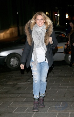 Katie Holmes w czarnej, puchowej kurtce i jeansach