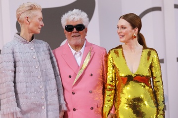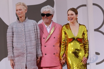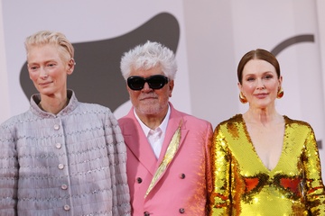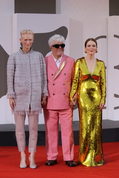 Tilda Swinton, Pedro Almodovar and Julianne Moore attend a red carpet for 'The Room Next Door' during the 81th Venice International Film Festival