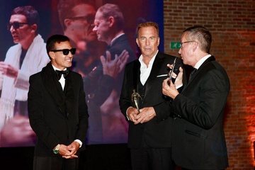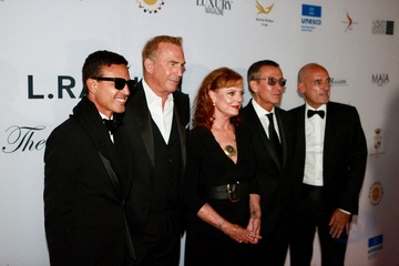 Omar Harfouch odbiera nagrodę za najlepsze osiągnięcie dla pokoju z rąk Kevina Costnera Wenecja Film Festiwal. 11
