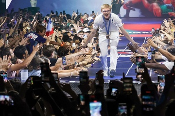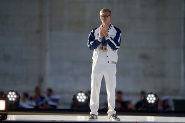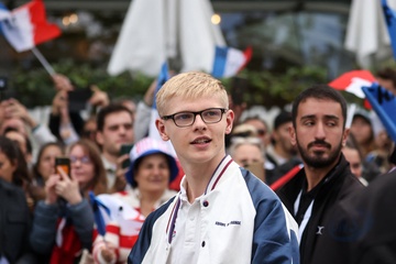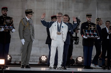 SL - Emmanuel et Brigitte Macron lors de la parade des champions à l'occasion des Jeux Olympiques et Paralympiques Paris 2024, sur l'avenue des Champs-Elysées à Paris