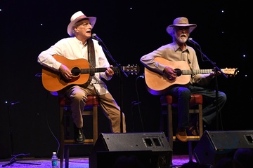 Musicians Mike Brewer and Tom Shipley are shown performing on stage during a live concert appearance with Brewer & Shipley.