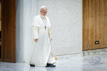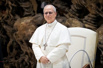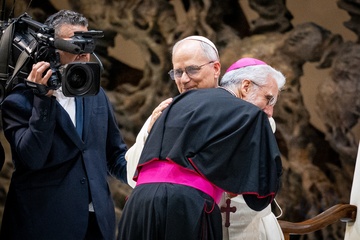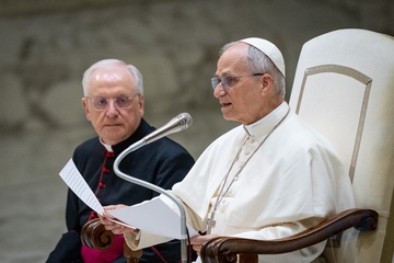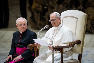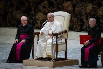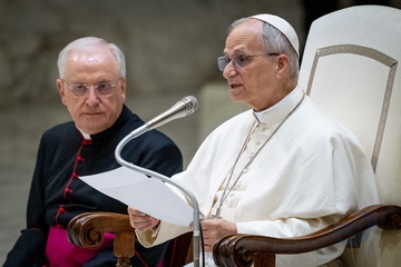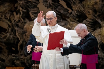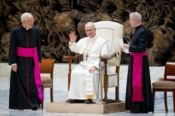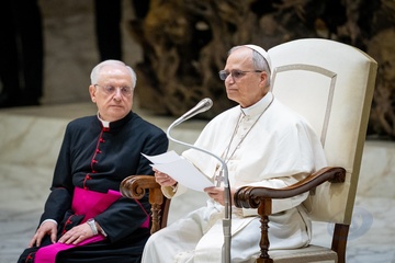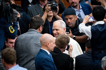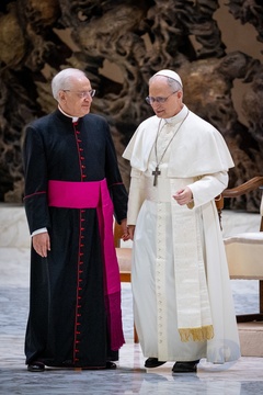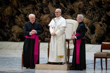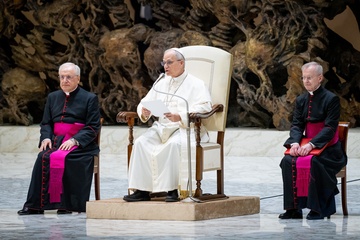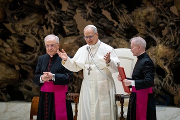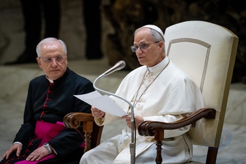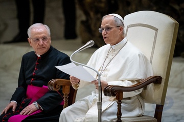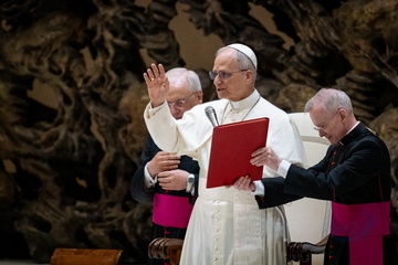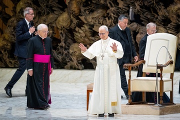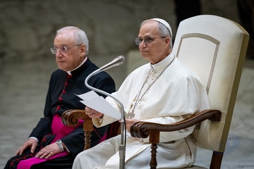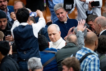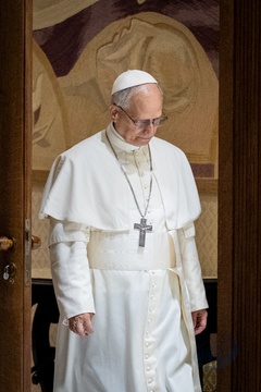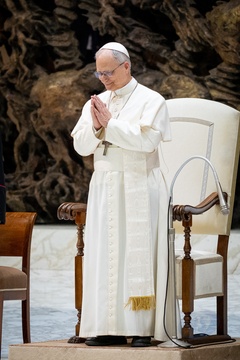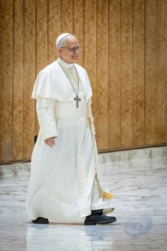 Pope Leo XIV meets members of the international media in the Paul VI Hall in Vatican City, Vatican, on 12 May 2025.