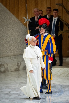 Papież Leon XIV spotyka się z przedstawicielami mediów międzynarodowych w Auli Pawła VI w Watykanie, 12 maja 2025 r.