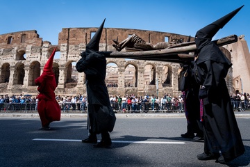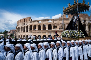 Confraternity members march in a procession through downtown Rome, near the Colosseum, during the Jubilee of Confraternities in Rome, Italy, on 17 May 2025.