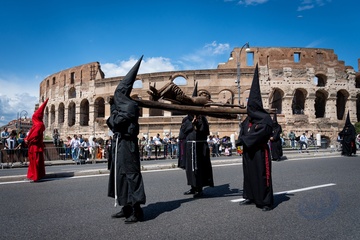Confraternity members march in a procession through downtown Rome, near the Colosseum, during the Jubilee of Confraternities in Rome, Italy, on 17 May 2025. 35