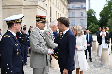 Prezydent Emmanuel Macron z żoną Brigitte Macron i prezydent Brazylii Luiz Inacio Lula da Silva z żoną Rosângelą da Silva biorą udział w oficjalnej ceremonii powitalnej w paryskim Hôtel des Invalides 53