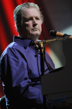 Musician Brian Wilson is shown performing on stage during a "live" concert appearance with The Beach Boys during their 50th Anniversary concert tour.