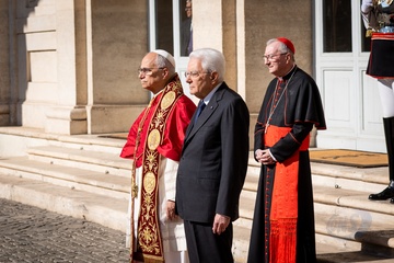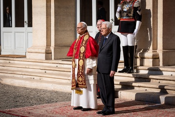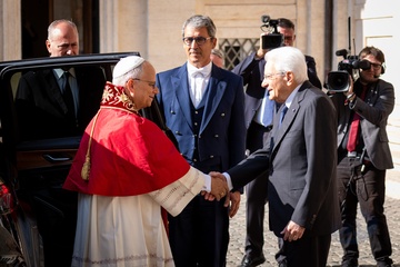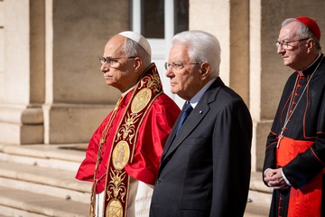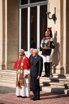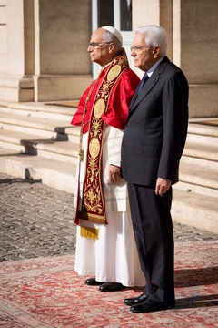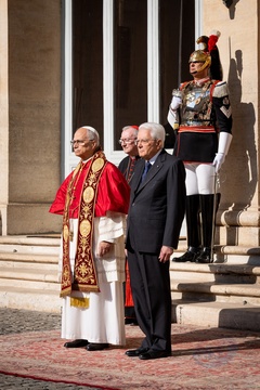 Pope Leo XIV is welcomed by Italian President Sergio Mattarella as he arrives at the Quirinale Presidential Palace in Rome, Italy, on 14 October, 2025. 27