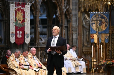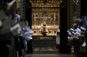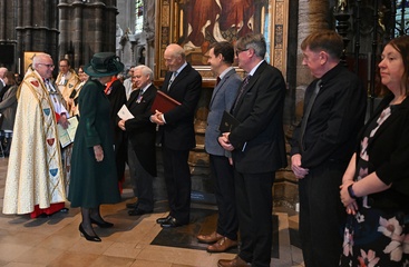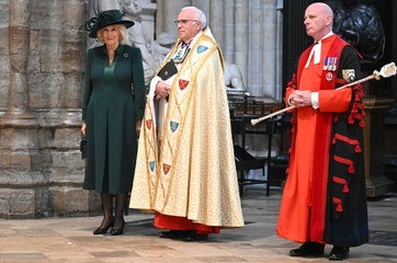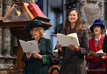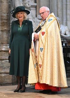 Britain's Queen Camilla attends the National Harvest Festival Service, at Westminster Abbey in London on October 16, 2025.