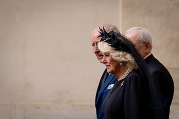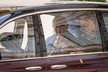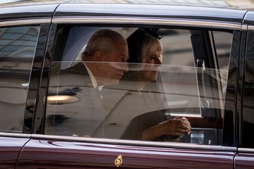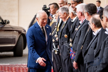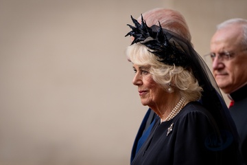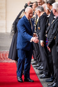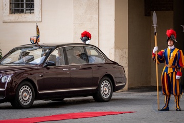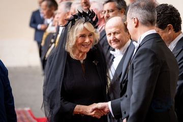 Britain's King Charles III and Queen Camilla arrive in the St. Damasus Courtyard at the Vatican for a state visit, where they will meet with Pope Leo XIV in Vatican City, Vatican, on 23 October 2025. 49