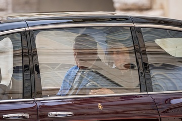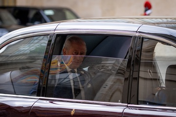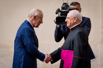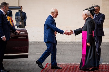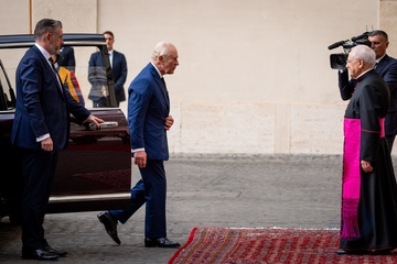 Britain's King Charles III and Queen Camilla arrive in the St. Damasus Courtyard at the Vatican for a state visit, where they will meet with Pope Leo XIV in Vatican City, Vatican, on 23 October 2025.