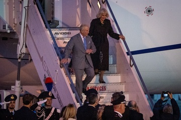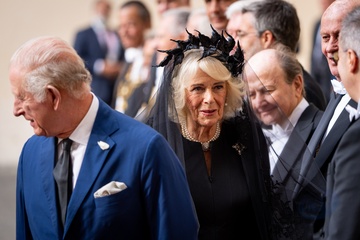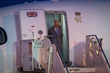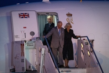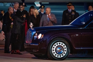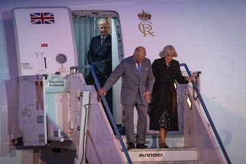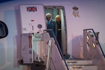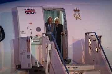 Britain's King Charles III and Queen Camilla arrive at Ciampino 31st Wing Airport in the outskirts of Rome, Italy, on 22 October 2025.
