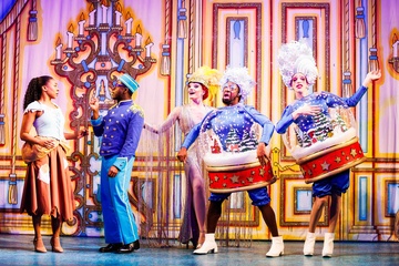 Siobhan James as Cinderella, Nicholas McLean as Buttons, Alexandra Waite-Roberts as Oblivia, the Wicked Stepmother and George Heyworth and Kat B as the Ugly Sisters Nausea and Flatula in the Cinderella Panto at the Hackney Empire in London on 2 December