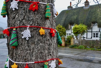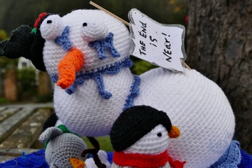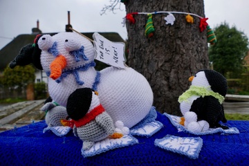 Pretty Village Yarn bombed for Christmas with a melting snowman climate change creation