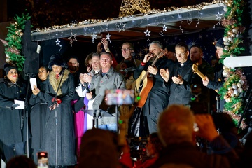 Tommy Robinson on stage at the Put Christ Back in Christmas protest. Whitehall, London, UK Saturday, 13th December.