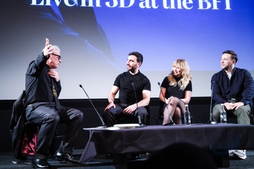 Mark Kermode, Brett Goldstein, Imogen Poots and William Bridges on stage during Mark Kermode in 3D on Monday 15 December 2025