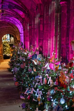Christmas trees on display within Chester cathedral at Christmas time. Chester, Cheshire, North west England.