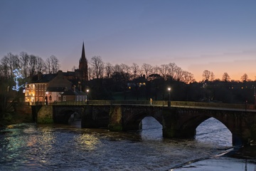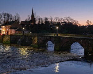 Sunset behind the old Dee bridge . Chester, Cheshire, North west England.