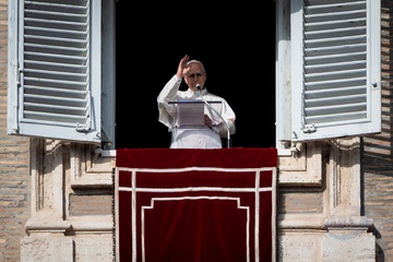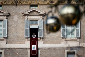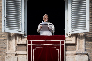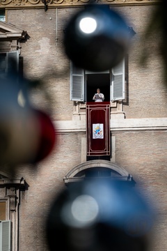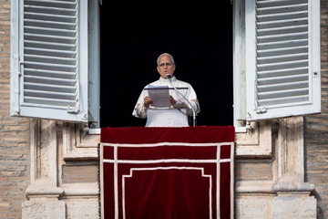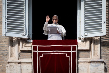Pope Leo XIV delivers his blessing as he recites the Angelus noon prayer from the window of his studio overlooking St. Peter's Square in Vatican City, Vatican, on 01 January 2026. 15