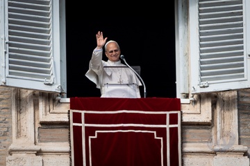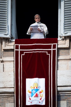 Pope Leo XIV delivers his blessing as he recites the Angelus noon prayer from the window of his studio overlooking St. Peter's Square in Vatican City, Vatican, on 01 January 2026.