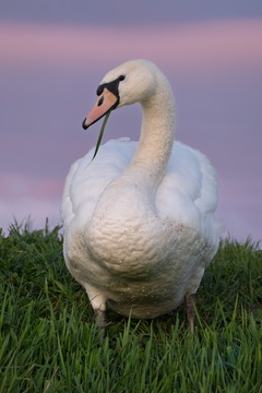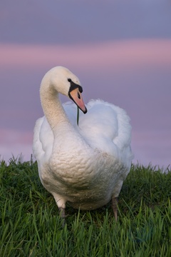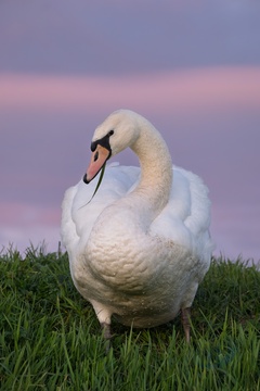 Adult swan lit by setting sun with coloured clouds behind. Ely, East Anglia, UK.