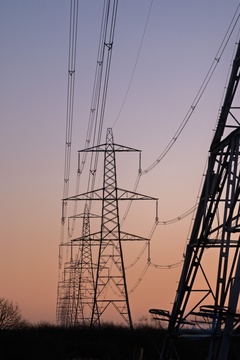 National grid power lines seen at sunset in the fens. East Anglia, UK.