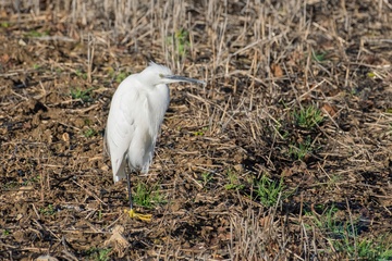 Little egret, Egretta garzetta on field in fens. Ely, Cambridgeshire, UK.