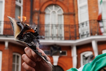 Protester burns Iranian passport, Iranian Consulate, London, UK.