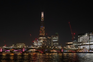 The Shard building seen by the River Thames at night in London.UK