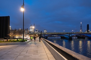 Bazalgette Embankment,adjacent to Victoria Embankment by Blackfriars bridge on the River Thames,a new piece of reclaimed land that hides the Tideway tunnel beneath.