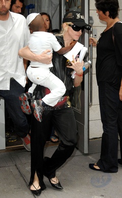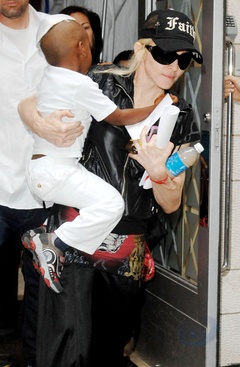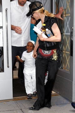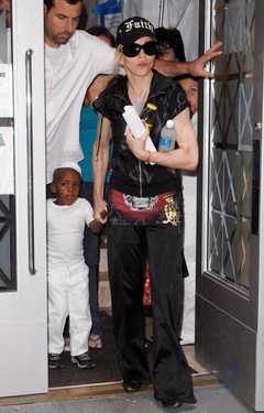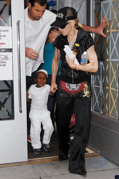 Madonna z adoptowanym synem Davidem wychodza z centrum Kabaly, Nowy Jork