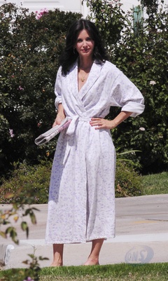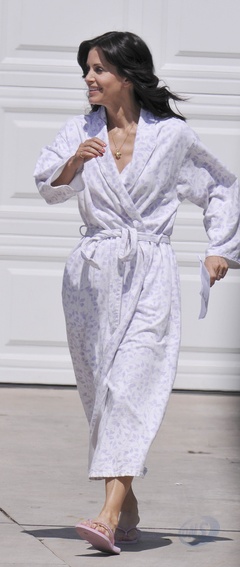 Courtney Cox Arquette w szlafroku na planie serialu "Cougar Town", Los Angeles