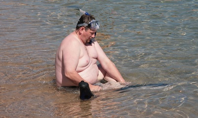 otyly mezczyzna w morzu w miejscowosci Canet De Mar